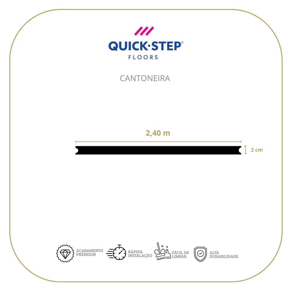 A Cantoneira Quick-Step fornece um acabamento perfeito para o seu piso. Quando necessário, também pode ser combinada com um rodapé já instalado, sendo utilizada principalmente em ambientes com móveis sob medida, contornando-os.
