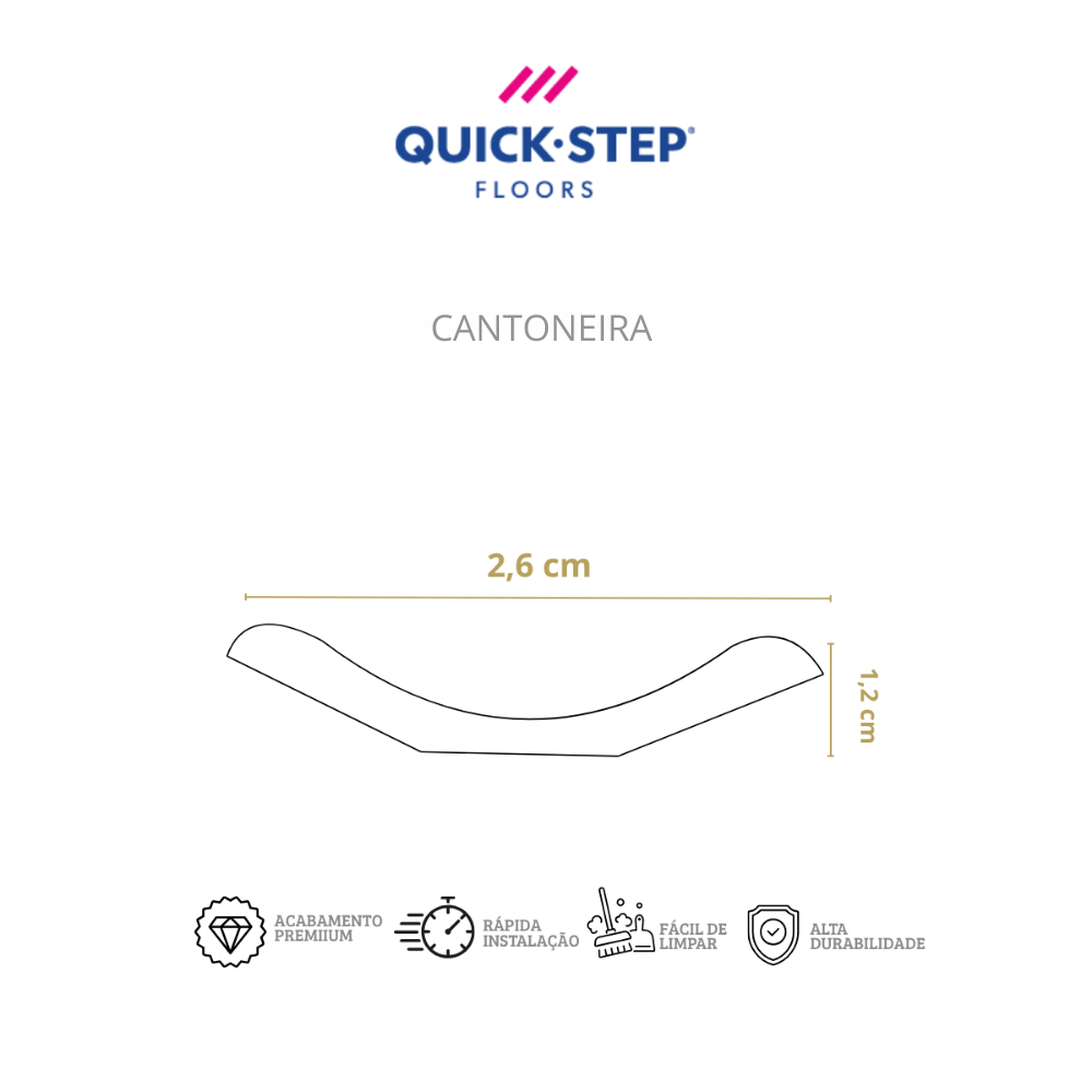A Cantoneira Quick-Step fornece um acabamento perfeito para o seu piso. Quando necessário, também pode ser combinada com um rodapé já instalado, sendo utilizada principalmente em ambientes com móveis sob medida, contornando-os.
