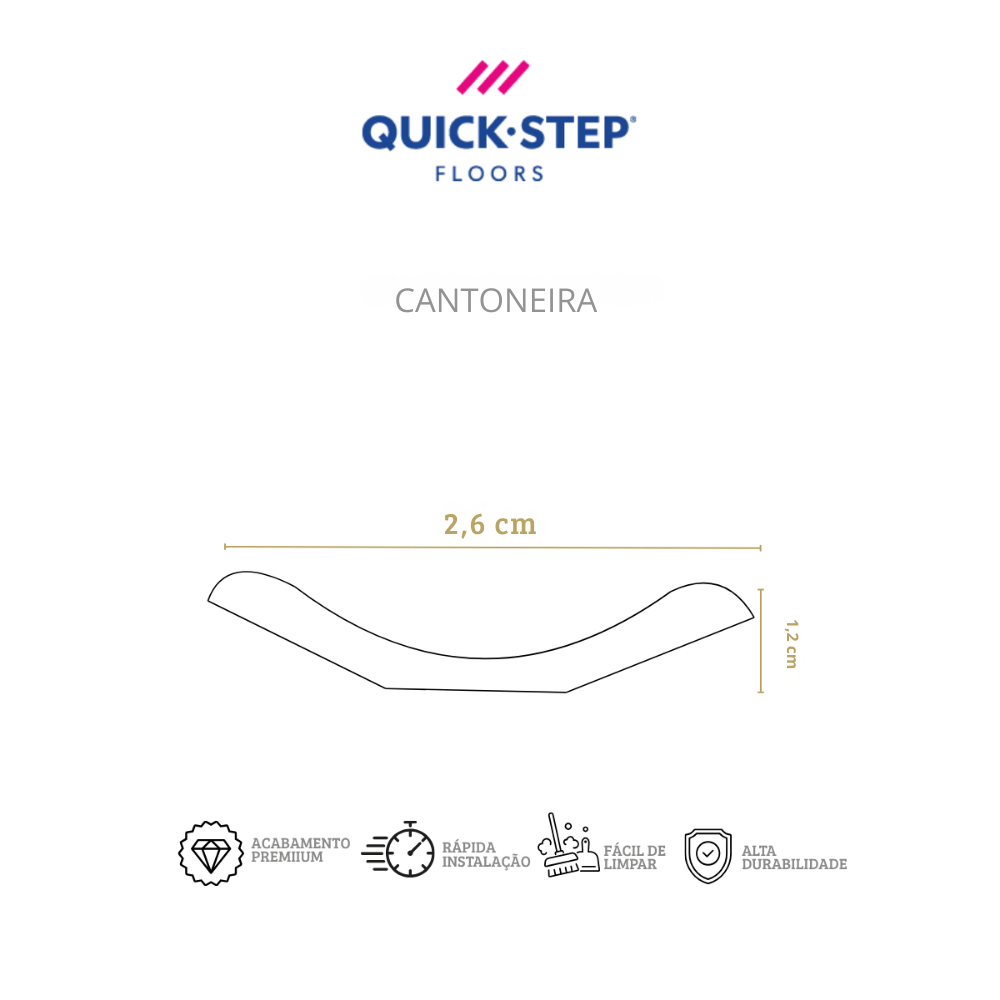 A Cantoneira Quick-Step fornece um acabamento perfeito para o seu piso. Quando necessário, também pode ser combinada com um rodapé já instalado, sendo utilizada principalmente em ambientes com móveis sob medida, contornando-os.