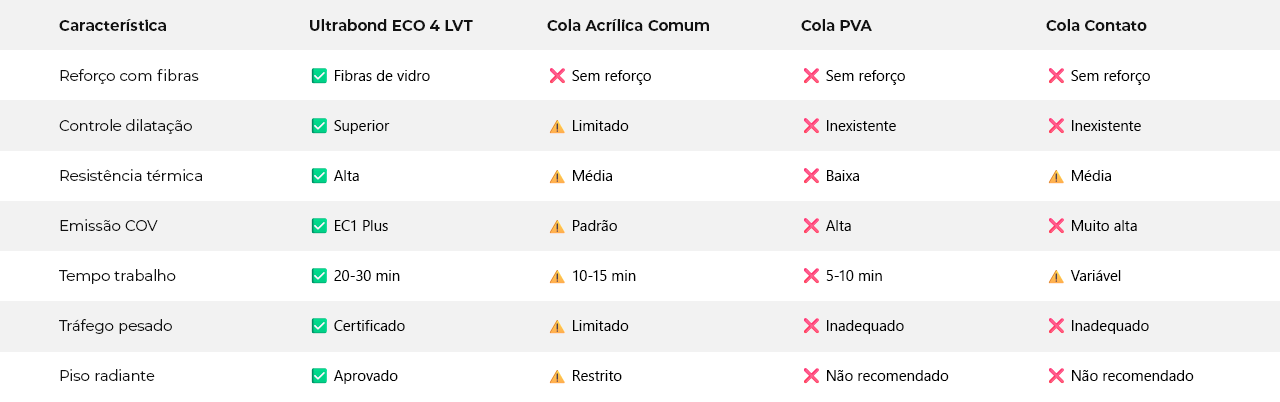 Exclusividade Técnica: As fibras de vidro incorporadas na fórmula fazem do Ultrabond Eco 4 LVT o único adesivo do mercado capaz de eliminar completamente a dilatação de pisos vinílicos LVT, mesmo em grandes variações térmicas.