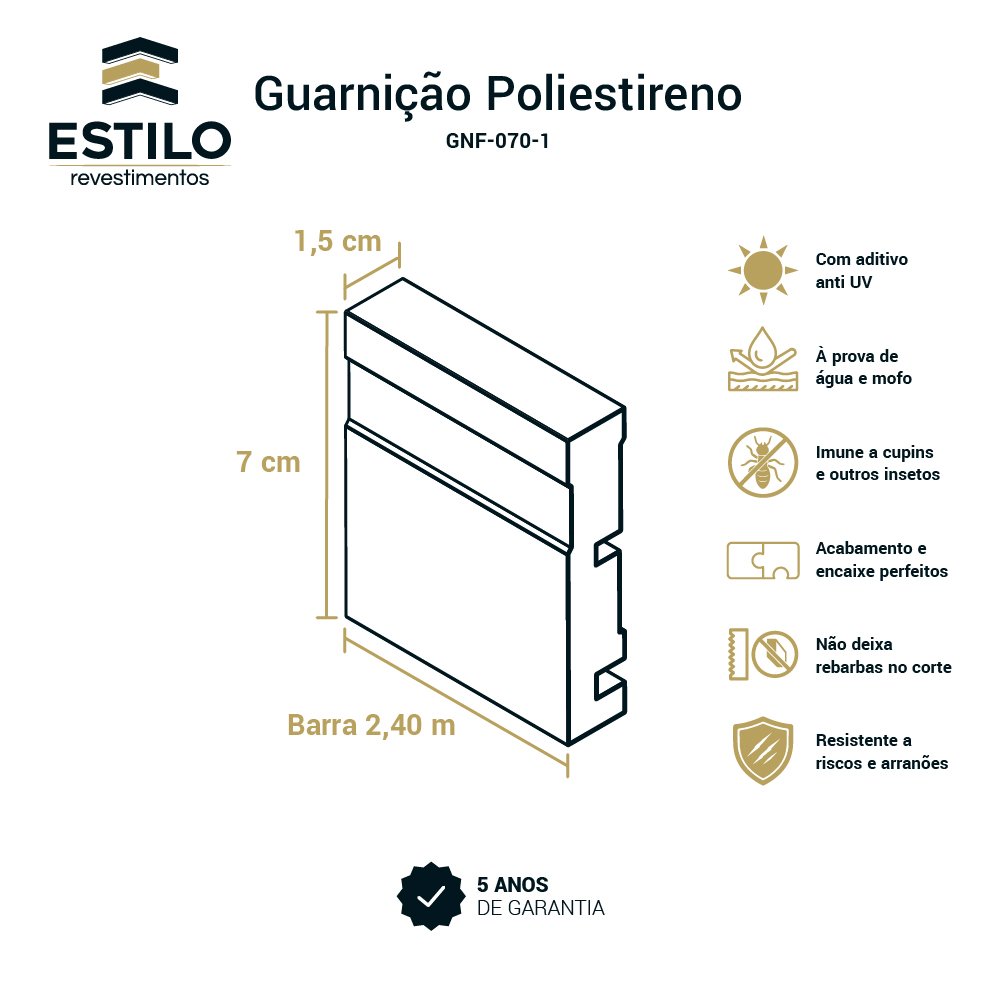 Tipo de produto Guarnição Material: Poliestireno Cor: Branco Modelo: Frisada Referência: 1354 Altura: 07 cm Espessura: 1,5 cm Largura: 2 cm Comprimento: 240 cm (2,40 m) Peso aproximado: 1.370 g Garantia: 5 anos