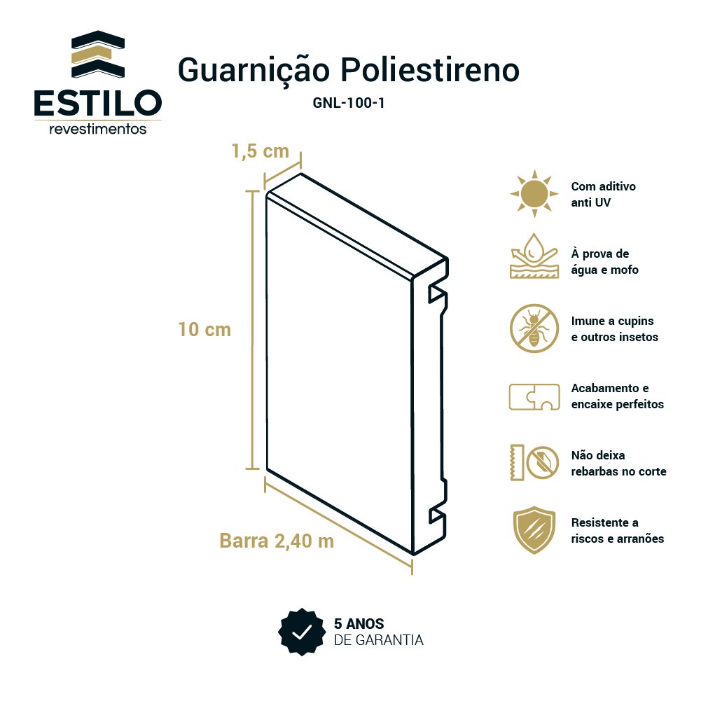 Tipo de produto Guarnição Material Poliestireno Cor Branco Modelo Liso Referência GNL-100-1 Altura 10 cm Espessura 1,5 cm Largura 2 cm Comprimento 240 cm (2,40 m) Peso aproximado 1.300g por barra Garantia 5 anos