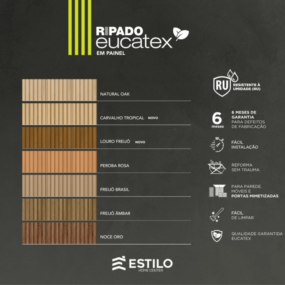 O Ripado Eucatex em barras é um revestimento versátil, prático e esteticamente agradável, projetado para personalizar ambientes. Pode ser utilizado em diversas superfícies internas, proporcionando detalhes decorativos e diferentes acabamentos. Resistente à umidade, é indicado para áreas secas e sua instalação é simples, utilizando cola conforme instruções fornecidas.