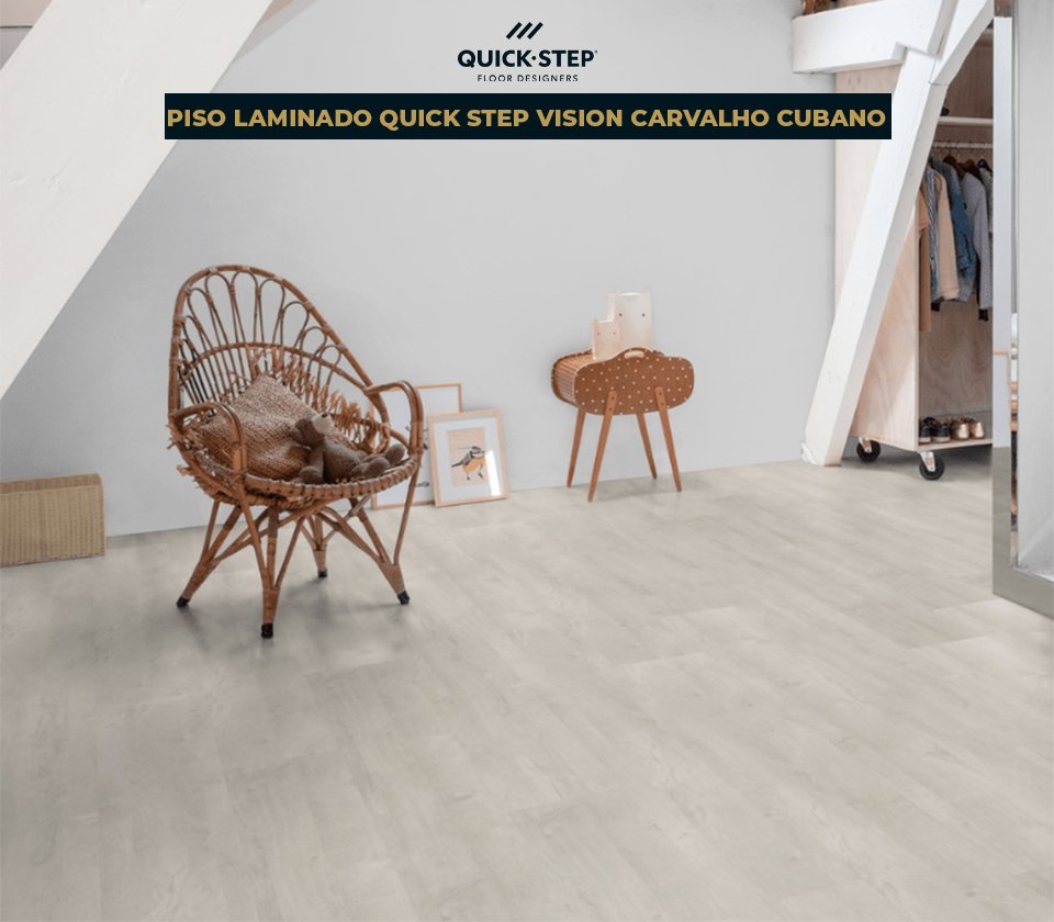 Além de sua tecnologia inovadora, o Quick Step VISION Carvalho Cubano se destaca pela robusta espessura de 8 mm e por suas réguas longas de 1,80 m, que criam um visual mais moderno, contínuo e elegante, ampliando a percepção de espaço e reforçando a sofisticação do ambiente.