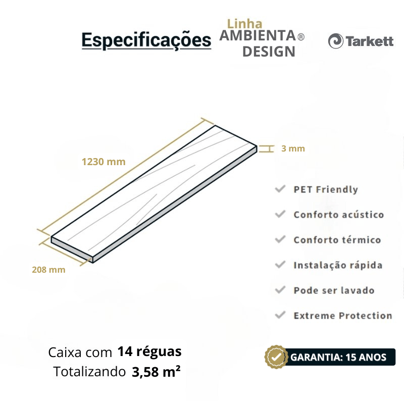 Marca  Tarkett Linha / Coleção   Ambienta Design Cor Amaranto Referência 24193688 Tipo de instalação  Colado Espessura da Peça (mm) 3mm Dimensões das réguas (mm)   3mm x 208mm x 1230mm Dimensões da régua   3mm (espessura) x 20,8cm (largura) x 123cm (comprimento) Capa de uso 0,70mm Quantidade de réguas na caixa  14 réguas Peso da caixa 5,150kg Metros quadrados por caixa   3,58m² Resistência  Residencial Tráfego Intenso / Comercial Tráfego Intenso Absorção Sonora  Sim Contra indicações   Áreas externas ou que molham facilmente Garantia 15 anos