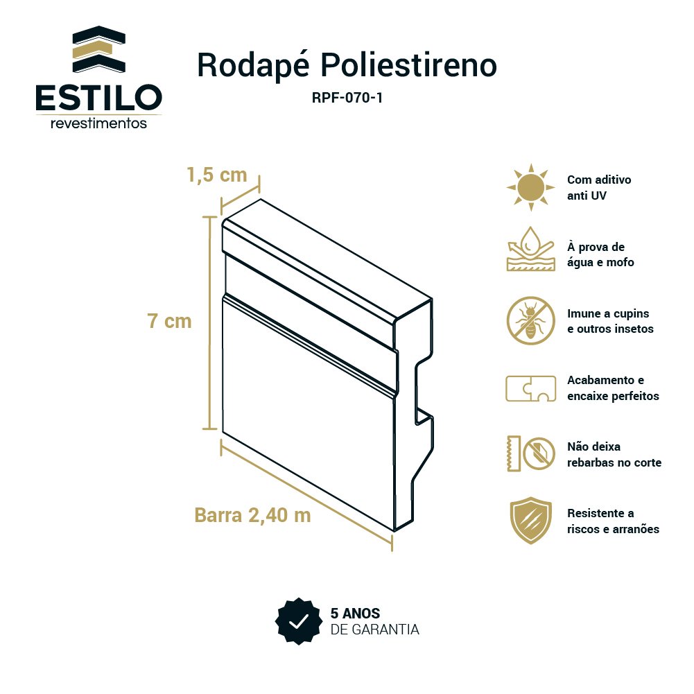 Tipo de produto Rodapé Material Poliestireno Cor Branco Modelo Frisado Referência RPF-070-1 Altura 7 cm Espessura 1,5 cm Comprimento 240 cm (2,40 m) Garantia 05 Anos Peso aproximado 790 g Ambiente de uso Interno Indicação de uso Residencial e comercial