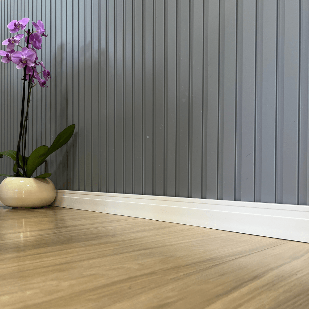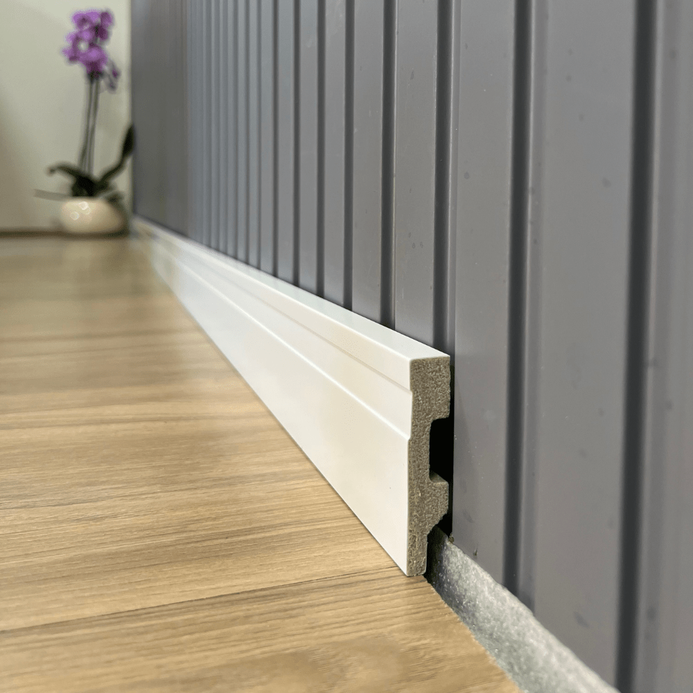 Acabamento moderno e discreto para a transição entre piso e parede.