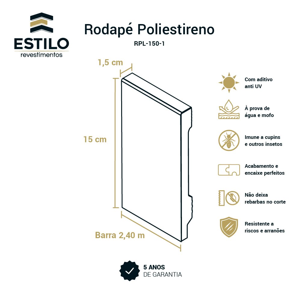 Tipo de produto Rodapé Material Poliestireno Cor Branco Modelo Liso Referência RPL-150-1 Altura 15 cm Espessura 1,5 cm Comprimento 240 cm (2,40 m) Garantia 05 Anos Peso aproximado 1.640 g Ambiente de uso Interno Indicação de uso Residencial e comercial