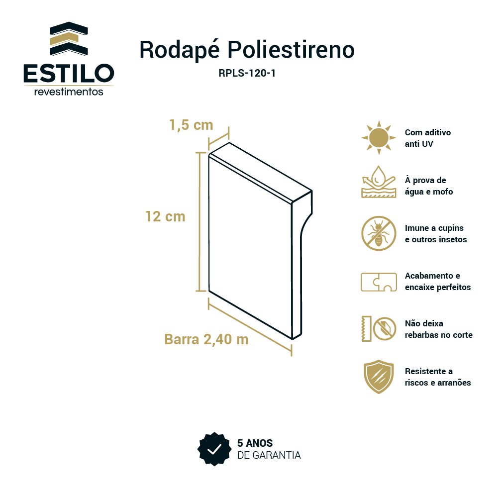 Rodapé de poliestireno liso na cor branca, com 12 cm de altura, ideal para quem busca um acabamento moderno e elegante. O modelo sobrepor permite instalação fácil sobre rodapés já existentes, valorizando a transição entre piso e parede. Fabricado em poliestireno, é resistente à umidade, fácil de limpar e indicado para ambientes internos. Seu comprimento de 2,40 m proporciona melhor aproveitamento na instalação, reduzindo emendas e garantindo um acabamento uniforme.